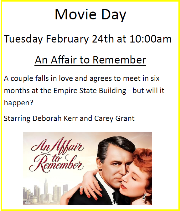 10:00am Movie: An Affair to Remember + Add to Google Calendar + iCal / Outlook export Date Tue, Feb 24, 2026 Time 10:00 am - 12:00 pm Category Entertainment & Celebration Share this event Support Our Programs and Activities Donate Now Sign up for our mailing list to get all of the latest PASC updates. Subscribe Here! Today's Events 24 Feb 8:00am Breakfast. Tuesday EVENT DETAIL 24 Feb 9:00am Walking Group. Tuesday, Black Rock Sanctuary EVENT DETAIL 24 Feb 9:30am Coffee Hour. Tuesday EVENT DETAIL 24 Feb 10:00am Mahjong. Tuesday EVENT DETAIL 24 Feb 10:00am Movie: An Affair to Remember Tuesday EVENT DETAIL 24 Feb 12:00pm Lunch. Tuesday EVENT DETAIL 24 Feb 12:45pm Pinochle @ Rec Center. Tuesday, Rec Center EVENT DETAIL 24 Feb 12:45pm Train Dominos. Tuesday EVENT DETAIL 24 Feb 1:00pm Pickleball @ Rec Center. Tuesday, Rec Center EVENT DETAIL 24 Feb 1:00pm Mahjong Lessons. Tuesday EVENT DETAIL 24 Feb 1:15pm Yoga. Tuesday EVENT DETAIL No event found!