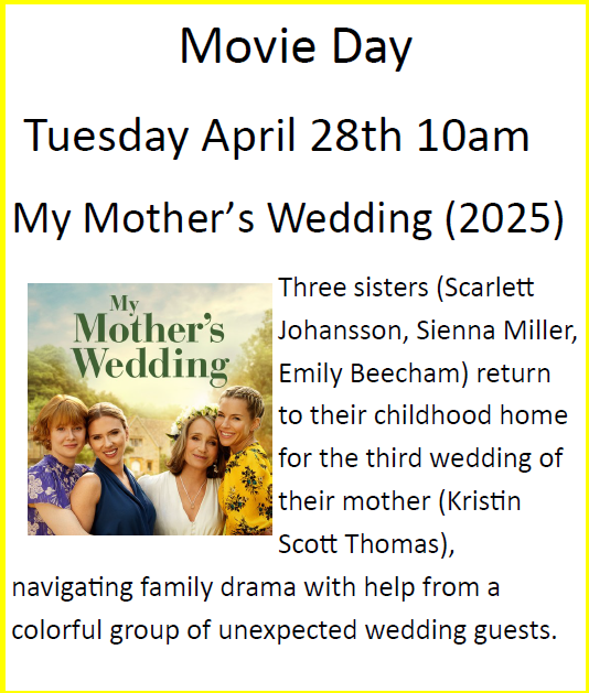 10:00am Movie: My Mother’s Wedding + Add to Google Calendar + iCal / Outlook export Date Tue, Apr 28, 2026 Expired! Time 10:00 am - 12:00 pm Category Entertainment & Celebration Share this event Support Our Programs and Activities Donate Now Sign up for our mailing list to get all of the latest PASC updates. Subscribe Here! Today's Events 29 Apr 8:00am Breakfast. Wednesday EVENT DETAIL 29 Apr 8:45am Circuit Exercise. Wednesday EVENT DETAIL 29 Apr 9:00am Wednesday Welcome Wagon. Wednesday EVENT DETAIL 29 Apr 9:30am Coffee Hour. Wednesday EVENT DETAIL 29 Apr 9:30am Indoor Walking Group @ Rec Center Wednesday, Rec Center EVENT DETAIL 29 Apr 9:45am Classic Exercise. Wednesday EVENT DETAIL 29 Apr 11:00am Mind Games. Wednesday EVENT DETAIL 29 Apr 12:00pm Lunch. Wednesday EVENT DETAIL 29 Apr 1:00pm Pickleball @ Rec Center. Wednesday, Rec Center EVENT DETAIL 29 Apr 1:00pm Digital Wellness Class. Wednesday EVENT DETAIL 29 Apr 1:00pm Bingo w/ Fieldstone @ Chester Springs Wednesday EVENT DETAIL 29 Apr 1:15pm Watercolor Art Class Wednesday EVENT DETAIL No event found!