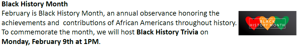 1:00pm Black History Trivia + Add to Google Calendar + iCal / Outlook export Date Mon, Feb 9, 2026 Expired! Time 1:00 pm - 2:00 pm Category Entertainment & Celebration Games Information & Education Share this event Support Our Programs and Activities Donate Now Sign up for our mailing list to get all of the latest PASC updates. Subscribe Here! Today's Events 04 Mar 8:00am Breakfast. Wednesday EVENT DETAIL 04 Mar 8:45am Circuit Exercise. Wednesday EVENT DETAIL 04 Mar 9:00am Wednesday Welcome Wagon. Wednesday EVENT DETAIL 04 Mar 9:30am Coffee Hour. Wednesday EVENT DETAIL 04 Mar 9:30am Kinetic Stretch. Wednesday EVENT DETAIL 04 Mar 9:30am Indoor Walking Group @ Rec Center Wednesday, Rec Center EVENT DETAIL 04 Mar 9:45am Classic Exercise. Wednesday EVENT DETAIL 04 Mar 11:00am Mind Games. Wednesday EVENT DETAIL 04 Mar 12:00pm Lunch. Wednesday EVENT DETAIL 04 Mar 1:00pm Pickleball @ Rec Center. Wednesday, Rec Center EVENT DETAIL 04 Mar 1:00pm Digital Wellness Class. Wednesday EVENT DETAIL 04 Mar 1:15pm Watercolor Art Class. Wednesday EVENT DETAIL No event found!