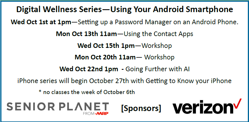 1:00pm Digital Wellness Class. + Add to Google Calendar + iCal / Outlook export Date Wed, Oct 15, 2025 Time 1:00 pm - 2:00 pm Category Information & Education Share this event Support Our Programs and Activities Donate Now Sign up for our mailing list to get all of the latest PASC updates. Subscribe Here! Today's Events 15 Oct 8:00am Breakfast. Wednesday EVENT DETAIL 15 Oct 8:00am Pickleball @ Forward Pickleball. Wednesday, Forward Pickleball EVENT DETAIL 15 Oct 8:45am Circuit Exercise. Wednesday EVENT DETAIL 15 Oct 9:00am Wednesday Welcome Wagon. Wednesday EVENT DETAIL 15 Oct 9:30am Coffee Hour. Wednesday EVENT DETAIL 15 Oct 9:30am Kinetic Stretch. Wednesday EVENT DETAIL 15 Oct 9:45am Classic Exercise. Wednesday EVENT DETAIL 15 Oct 11:00am Mind Games. Wednesday EVENT DETAIL 15 Oct 12:00pm Lunch. Wednesday EVENT DETAIL 15 Oct 1:00pm Pickleball @ Rec Center. Wednesday, Rec Center EVENT DETAIL 15 Oct 1:00pm Digital Wellness Class. Wednesday EVENT DETAIL 15 Oct 1:00pm Volunteer Craft Wednesday EVENT DETAIL 15 Oct 1:15pm Watercolor Art Class. Wednesday EVENT DETAIL 15 Oct 2:15pm Grief Support Group. Wednesday EVENT DETAIL No event found!