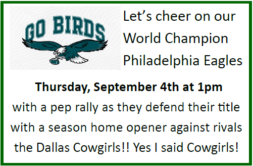 1:00pm Eagles Pep Rally + Add to Google Calendar + iCal / Outlook export Date Thu, Sep 4, 2025 Expired! Time 1:00 pm - 2:00 pm Category Entertainment & Celebration Share this event Support Our Programs and Activities Donate Now Sign up for our mailing list to get all of the latest PASC updates. Subscribe Here! Today's Events No event found!