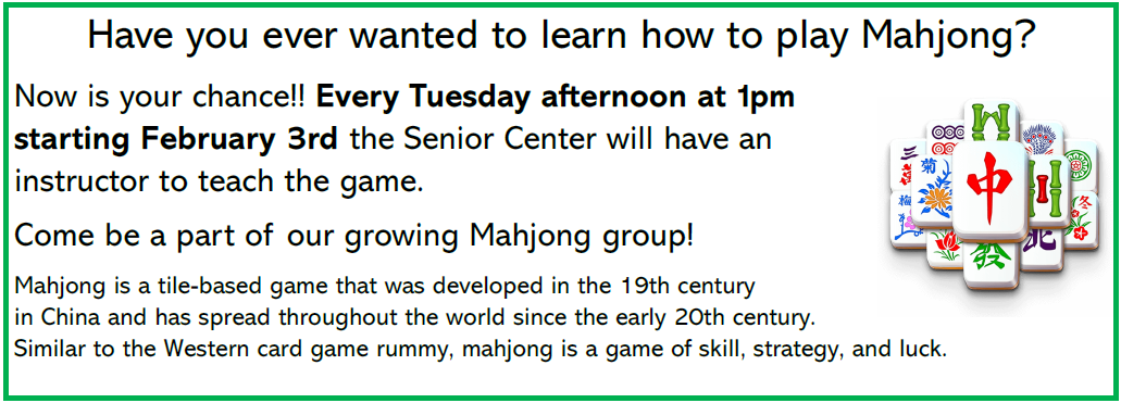 1:00pm Mahjong Lessons. + Add to Google Calendar + iCal / Outlook export Date Tue, Feb 17, 2026 Time 1:00 pm - 2:00 pm Category Games Share this event Support Our Programs and Activities Donate Now Sign up for our mailing list to get all of the latest PASC updates. Subscribe Here! Today's Events 17 Feb 8:00am Breakfast. Tuesday EVENT DETAIL 17 Feb 9:00am Walking Group. Tuesday, Black Rock Sanctuary EVENT DETAIL 17 Feb 9:30am Coffee Hour. Tuesday EVENT DETAIL 17 Feb 10:00am Mahjong. Tuesday EVENT DETAIL 17 Feb 10:00am Spa Day w/ Melissa Tuesday EVENT DETAIL 17 Feb 12:00pm State Sen. Muth’s Mobile Office. Tuesday EVENT DETAIL 17 Feb 12:00pm Lunch. Tuesday EVENT DETAIL 17 Feb 12:00pm Chinese New Year Lunch Tuesday EVENT DETAIL 17 Feb 12:30pm Mardi Gras Treats Tuesday EVENT DETAIL 17 Feb 12:45pm Pinochle @ Rec Center. Tuesday, Rec Center EVENT DETAIL 17 Feb 12:45pm Train Dominos. Tuesday EVENT DETAIL 17 Feb 1:00pm Pickleball @ Rec Center. Tuesday, Rec Center EVENT DETAIL 17 Feb 1:00pm Mahjong Lessons. Tuesday EVENT DETAIL 17 Feb 1:15pm Yoga. Tuesday EVENT DETAIL No event found!