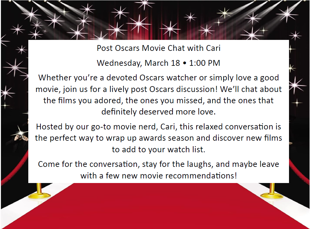 1:00pm Movie Chat with Cari (new date) Movie Chat with Cari has moved to Tuesday, March 24th at 1pm. See you then! + Add to Google Calendar + iCal / Outlook export Date Tue, Mar 24, 2026 Time 1:00 pm - 2:00 pm Category Entertainment & Celebration Information & Education Social & Discussion Share this event Support Our Programs and Activities Donate Now Sign up for our mailing list to get all of the latest PASC updates. Subscribe Here! Today's Events 24 Mar 8:00am Breakfast. Tuesday EVENT DETAIL 24 Mar 9:00am Walking Group. Tuesday, Black Rock Sanctuary EVENT DETAIL 24 Mar 9:30am Coffee Hour. Tuesday EVENT DETAIL 24 Mar 10:00am Mahjong. Tuesday EVENT DETAIL 24 Mar 10:00am Movie: The Ballad of Wallis Island Tuesday EVENT DETAIL 24 Mar 12:00pm Lunch. Tuesday EVENT DETAIL 24 Mar 12:45pm Pinochle @ Rec Center. Tuesday, Rec Center EVENT DETAIL 24 Mar 12:45pm Train Dominos. Tuesday EVENT DETAIL 24 Mar 1:00pm Pickleball @ Rec Center. Tuesday, Rec Center EVENT DETAIL 24 Mar 1:00pm Mahjong Lessons. Tuesday EVENT DETAIL 24 Mar 1:00pm Movie Chat with Cari (new date) Tuesday EVENT DETAIL 24 Mar 1:15pm Yoga. Tuesday EVENT DETAIL No event found!