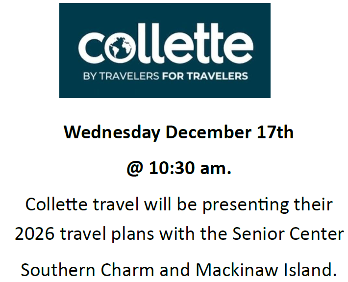 10:30am Collette Travel Presentation + Add to Google Calendar + iCal / Outlook export Date Wed, Dec 17, 2025 Time 10:30 am - 11:30 am Category Information & Education Share this event Support Our Programs and Activities Donate Now Sign up for our mailing list to get all of the latest PASC updates. Subscribe Here! Today's Events 16 Dec 8:00am Breakfast. Tuesday EVENT DETAIL 16 Dec 8:00am Hanukkah Breakfast Tuesday EVENT DETAIL 16 Dec 9:00am Walking Group. Tuesday, Black Rock Sanctuary EVENT DETAIL 16 Dec 9:30am Coffee Hour. Tuesday EVENT DETAIL 16 Dec 10:00am Mahjong. Tuesday EVENT DETAIL 16 Dec 11:00am 8 Week Challenge to Healthy Eating. Tuesday EVENT DETAIL 16 Dec 12:00pm State Sen. Muth’s Mobile Office. Tuesday EVENT DETAIL 16 Dec 12:00pm Lunch. Tuesday EVENT DETAIL 16 Dec 12:45pm Pinochle. Tuesday EVENT DETAIL 16 Dec 12:45pm Train Dominos. Tuesday EVENT DETAIL 16 Dec 1:00pm Pickleball @ Rec Center. Tuesday, Rec Center EVENT DETAIL 16 Dec 1:15pm Yoga. Tuesday EVENT DETAIL No event found!