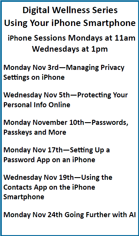 11:00am Digital Wellness Class. + Add to Google Calendar + iCal / Outlook export Date Mon, Nov 3, 2025 Time 10:45 am - 11:45 am Category Information & Education Share this event Support Our Programs and Activities Donate Now Sign up for our mailing list to get all of the latest PASC updates. Subscribe Here! Today's Events 03 Nov 8:00am Continental Breakfast. Monday EVENT DETAIL 03 Nov 8:45am Circuit Exercise. Monday EVENT DETAIL 03 Nov 9:30am Coffee Hour. Monday EVENT DETAIL 03 Nov 9:45am Classic Exercise. Monday EVENT DETAIL 03 Nov 10:30am Produce Pickup. Monday EVENT DETAIL 03 Nov 11:00am Digital Wellness Class. Monday EVENT DETAIL 03 Nov 11:00am Spanish Class. Monday EVENT DETAIL 03 Nov 12:00pm Lunch. Monday EVENT DETAIL 03 Nov 1:00pm Pickleball @ Rec Center. Monday, Rec Center EVENT DETAIL 03 Nov 1:00pm Tai Chi. Monday EVENT DETAIL No event found!