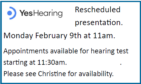 11:00am Yes Hearing Presentation + Add to Google Calendar + iCal / Outlook export Date Mon, Feb 9, 2026 Expired! Time 11:00 am - 12:00 pm Category Information & Education Wellness Share this event Support Our Programs and Activities Donate Now Sign up for our mailing list to get all of the latest PASC updates. Subscribe Here! Today's Events 04 Mar 8:00am Breakfast. Wednesday EVENT DETAIL 04 Mar 8:45am Circuit Exercise. Wednesday EVENT DETAIL 04 Mar 9:00am Wednesday Welcome Wagon. Wednesday EVENT DETAIL 04 Mar 9:30am Coffee Hour. Wednesday EVENT DETAIL 04 Mar 9:30am Kinetic Stretch. Wednesday EVENT DETAIL 04 Mar 9:30am Indoor Walking Group @ Rec Center Wednesday, Rec Center EVENT DETAIL 04 Mar 9:45am Classic Exercise. Wednesday EVENT DETAIL 04 Mar 11:00am Mind Games. Wednesday EVENT DETAIL 04 Mar 12:00pm Lunch. Wednesday EVENT DETAIL 04 Mar 1:00pm Pickleball @ Rec Center. Wednesday, Rec Center EVENT DETAIL 04 Mar 1:00pm Digital Wellness Class. Wednesday EVENT DETAIL 04 Mar 1:15pm Watercolor Art Class. Wednesday EVENT DETAIL No event found!